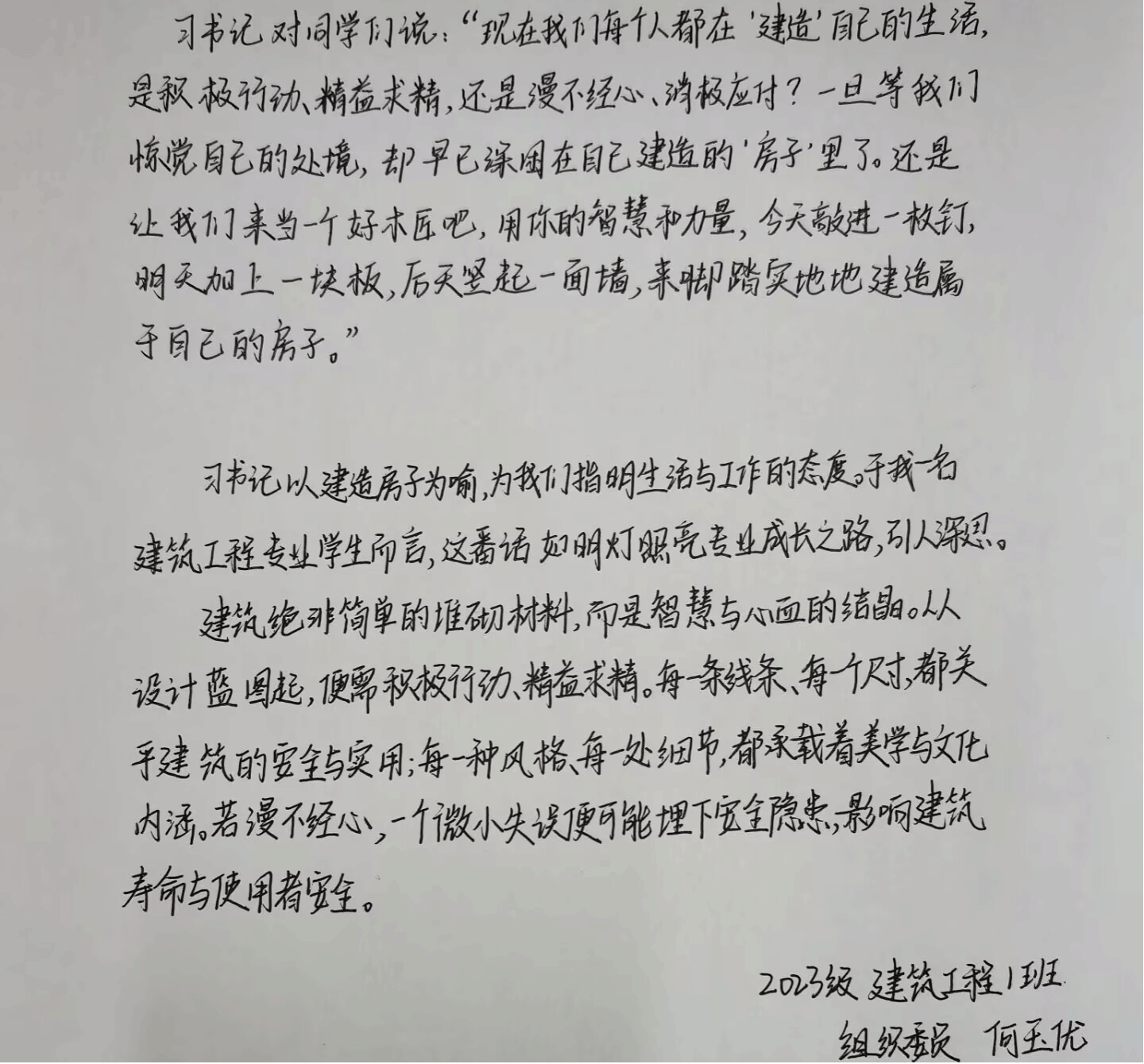 建筑环境与能源应用工程3班班长蒋晓山同学也分享了自己的感悟:“我深切领会到习近平总书记对大学生始终如一的关怀,习近平总书记强调青年要‘自找苦吃’、扎根基层、投身实践 ,把个人理想融入国家发展。作为建环专业的新时代大学生,我们应牢记这些嘱托,在专业领域不断钻研,用所学优化建筑环境,为能源高效利用出力,诠释青春担当,不负时代,不负韶华。”