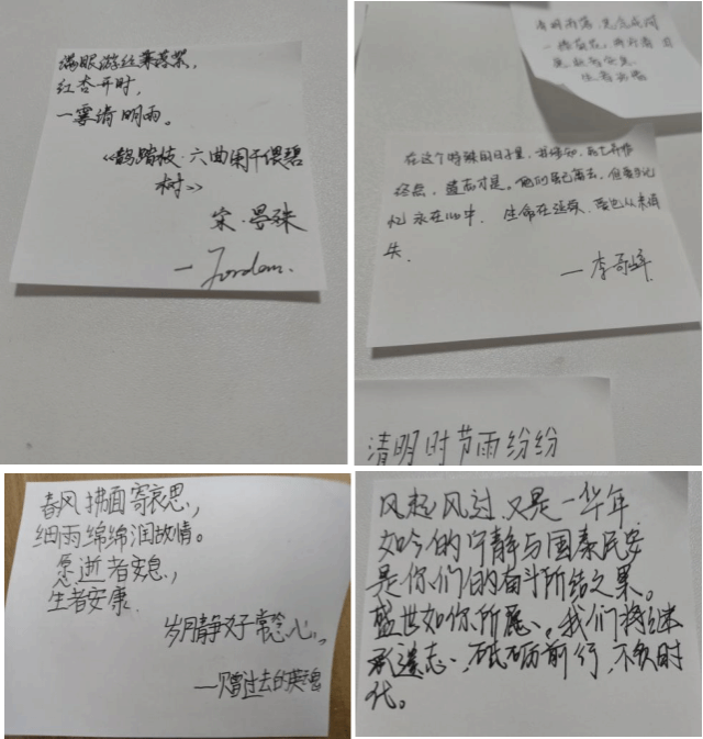 信笺书写区氛围庄重肃穆,同学们提笔写下对先烈先贤的崇敬与对逝去亲人的思念。有人摘录“清明时节雨纷纷”等经典诗句致敬传统;有人以“山河无恙,如您所愿”告慰英灵;亦有同学倾诉家书:“记忆如星火,思念永不熄。”活动尾声,纸花与信笺陈列成“思念之墙”,白花如雪、墨香萦绕,无声传递着跨越时空的情感共鸣。