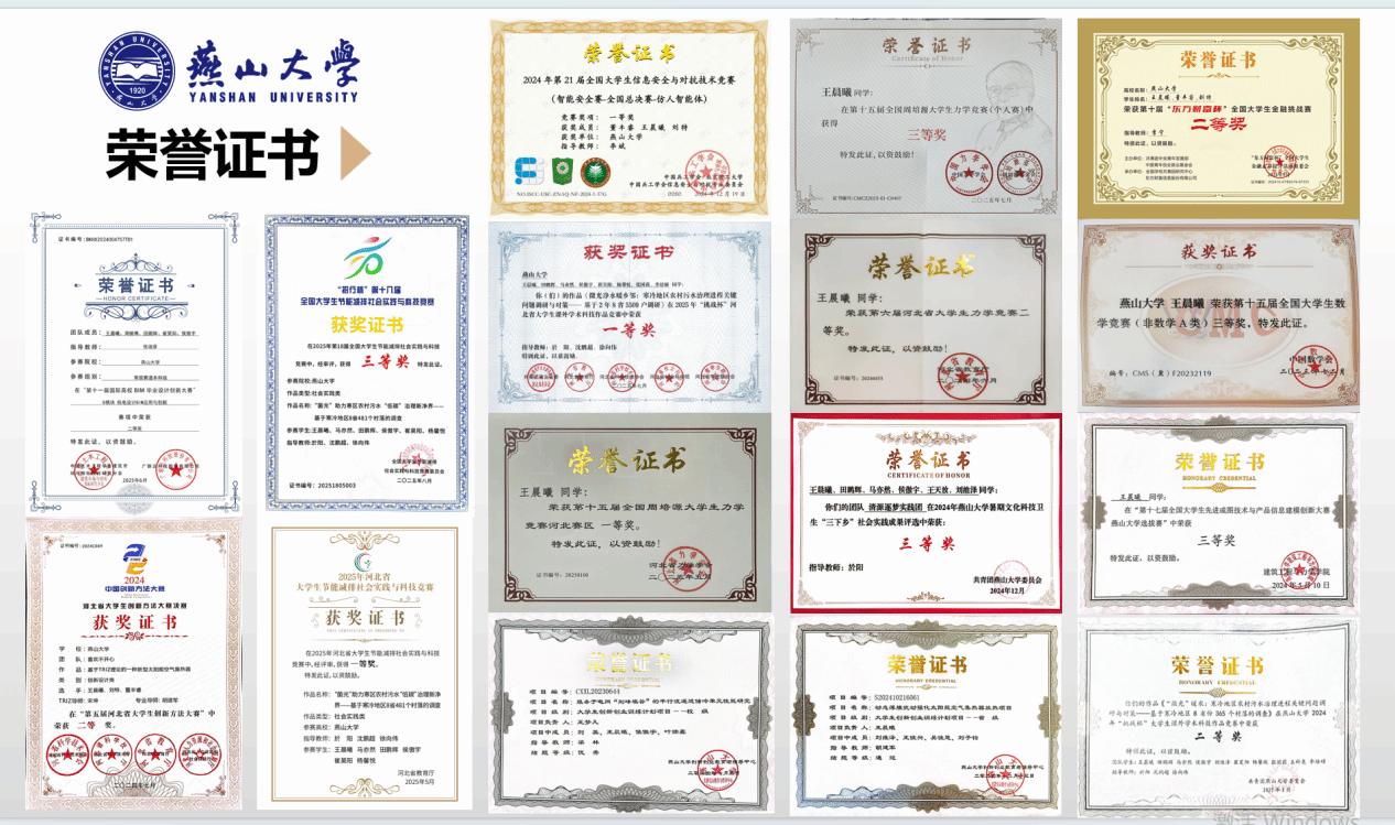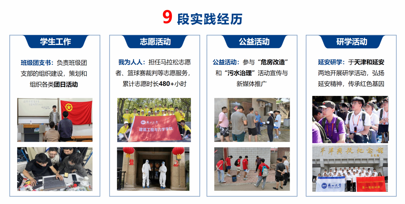 学习与科研之外,王晨曦始终保有一颗温暖而奉献的心。他积极参与社会实践,所在团队获评全国“三下乡”社会实践河北省重点团队;志愿服务累计时长超过480小时——从迎新引导到抗疫值守,从赛事裁判到马拉松服务,在每一个被需要的地方,他都以行动传递善意与能量。在他看来,奉献不仅是付出,更是成长,是在服务中看见更广阔的世界,在行动中锤炼更坚韧的品格。