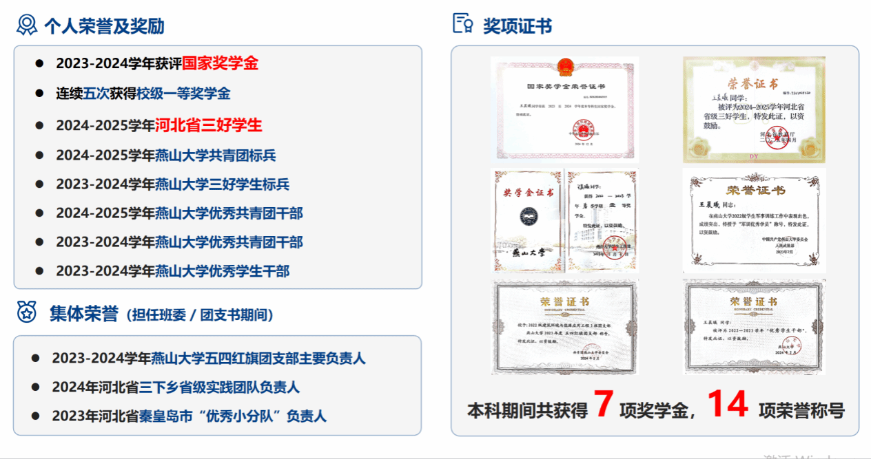获“河北省三好学生”等14项荣誉称号
